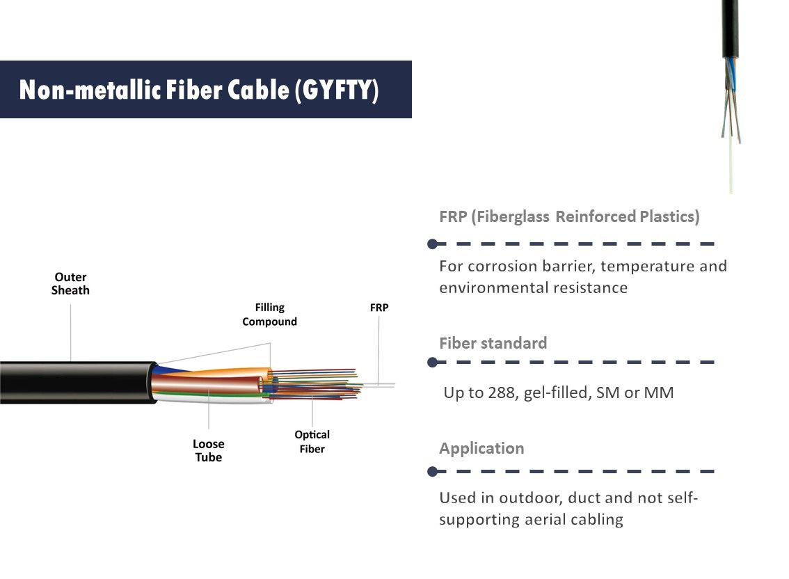 سلك الألياف الضوئية GYFTY عبارة عن كبل غير معدني يستخدم في نظام نقل الطاقة والواجهة الكهرومغناطيسية العالية. إنه كابل ألياف ضوئية مثالي لتأثير حماية الإضاءة مع جميع المواد العازلة.
